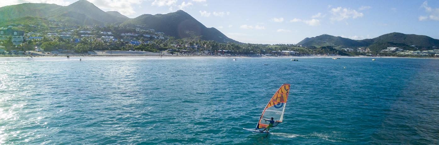 An aerial view of a colorful town surrounded by water and lush green mountains behind.